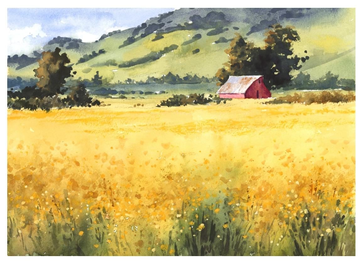 Spring In The Valley is a live online Watercolor Mastery Workshop built around one deceptively simple scene — a pink barn resting in the glowing fields of Los Osos Valley Road. At first glance it feels peaceful and straightforward. But what truly makes this painting work isn’t the barn - it’s the light, the warmth of early blooms across the field, the transition from gold to green, and the subtle distance in those rolling hills. In this workshop, I’ll show you how to simplify a landscape like this into strong, readable design so the light does the heavy lifting. You’ll learn how to handle large glowing washes without losing control, how to use warm and cool shifts to create depth, how to keep yellows luminous instead of chalky, and how to place a focal point so it feels natural and intentional rather than pasted on.