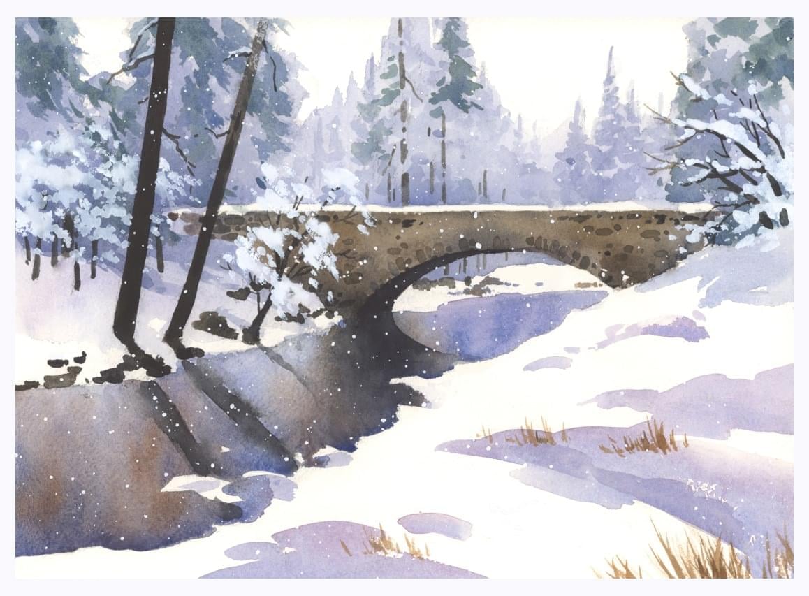 A repeatable process for planning winter landscapes, from value sketches to final accents, that you can use for any snowy scene.
